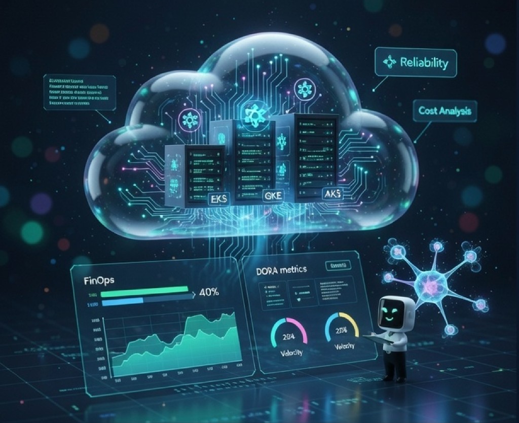 We build cloud-native operational intelligence platforms that unify metrics, logs, traces, costs, and incidents into a single AI-powered view. Kubernetes orchestration on EKS, GKE, and AKS with Infrastructure-as-Code that eliminates configuration drift. FinOps frameworks that have reduced cloud spend by 40% while improving availability to 99.99%. DORA metrics that quantify engineering velocity and SRE practices that make reliability a measurable discipline. And AI-powered observability that answers reliability, delivery, cost, and risk questions in natural language using real telemetry from Prometheus, Grafana, and OpenTelemetry — not dashboards your team has to interpret, but intelligence that interprets itself.